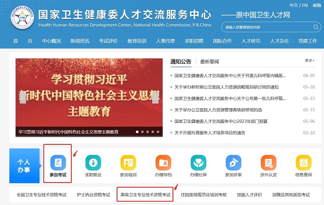 图1:进入国家卫生健康委人才交流服务中心网站,进入参加考试—高级卫生专业技术资格考试