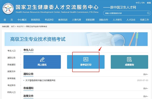 考生可在规定期限内,登录国家卫生健康委人才交流服务中心网站(),进入“参加考试—高级卫生专业技术资格考试—准考证打印”,打印准考证。
