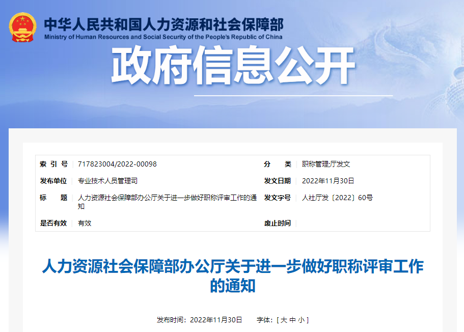 2022年11月30日,国家人力资源社会保障部办公厅印发《关于进一步做好职称评审工作的通知》。通知主要从调整职称评审专业、完善职称评审标准、创新职称评审机制、优化职称评审服务等四个方面提出改革举措。