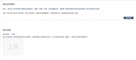 考生按常规报名流程进入国家医学考试考生系统,查看自己的报名信息,在报名信息处,点击“上传相关材料”按钮,按页面提示进入报名材料上传界面。