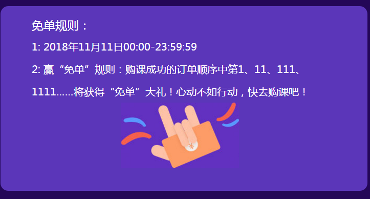 活动三:“免单”“免单”“免单”!2018年11月11日00:00-23:59:59(仅限11月11日当天),立即购课成功的订单顺序中第1、11、111、1111……将获得“免单”大礼!