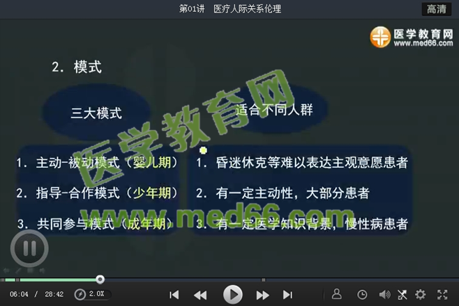 “医患关系模式”是有三种模式,主动-被动模式、指导-合作模式、共同参与模式。