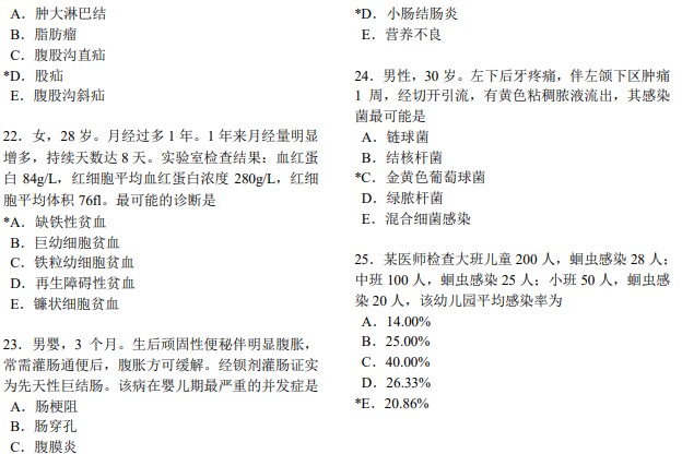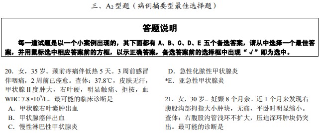 医学综合考试全部采用选择题形式。各类选择题均由题干和选项两部分组成。题干是试题的主体,可由一段短语、问句或不完全的陈述句组成,也可由一段病例、图表、照片或其它临床资料来表示;选项由可供选择的词组或短句组成,也称备选答案。