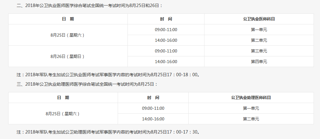 二、2018年公卫执业医师医学综合笔试全国统一考试时间为8月25日和26日: