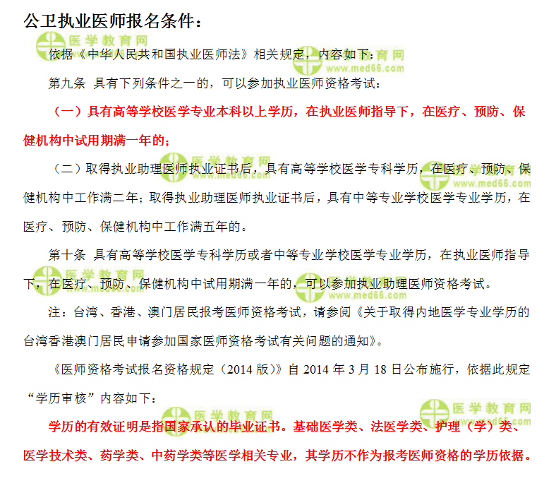 3.专升本医学本科毕业生,2015年9月1日以后升入本科的,其专业必须与专科专业相同或相近,其本科学历方可作为报考医师资格的学历依据。