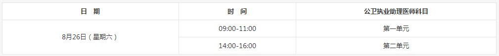 2017年公卫助理医师医学综合笔试全国统一考试时间如下:公卫类别执业/助理医师全国实行计算机化考试:2017年8月26日(上午9:00-11:00,下午14:00-16:00).
