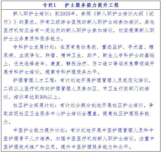 “十三五”期间,重点开展新入职护士、专科护士、护理管理人员、社区护士、助产士等人员培训,切实提高护理服务能力和管理水平。