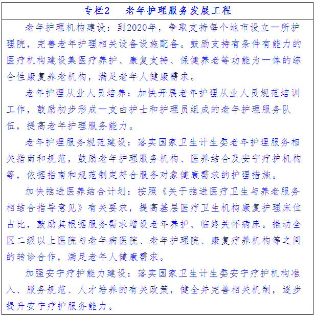 ——逐步健全老年护理服务体系。大力加强老年护理服务队伍和机构建设,规范老年护理服务行为。不断发展社区和居家护理服务,进一步促进医养结合、安宁疗护以及护理服务业发展,不断满足老年人健康服务需求。