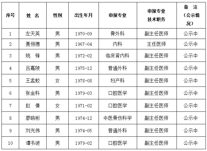经审核,拟推荐左天英等10名同志参加2017年度民营医疗机构卫生专业技术高级职务任职资格“专项评审”,现予公示。
