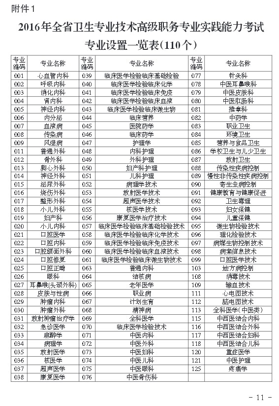 2016年贵州省卫生专业技术高级专业实践能力考试专业设置一览表: