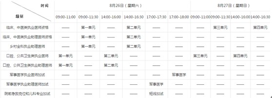 医师资格考试分实践技能考试和医学综合笔试两部分,2017年实践技能考试时间为6月17日-6月23日,具体由各省、自治区、直辖市医师资格考试领导小组组织实施。2017年医师医学综合笔试考试时间集中在2017年8月26日和27日,口腔、公卫采用机考,时间为2小时,其余科目为纸笔作答,时间为2个半小时。具体安排如下: