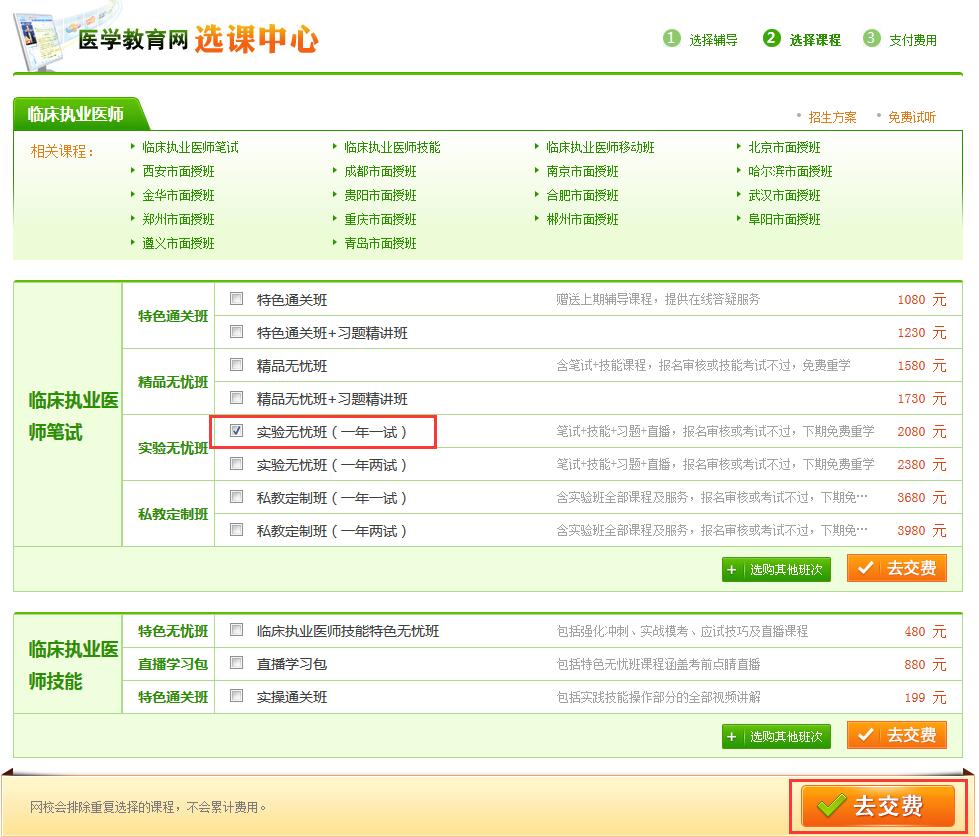 确定自己要选择的辅导课程后,可以通过网校首页的“快速选课”进入选课中心,或各辅导页及招生方案页面进行选课。以进入“选课中心”选购“临床执业医师辅导”为例,可以按照以下方式进行课程购买。