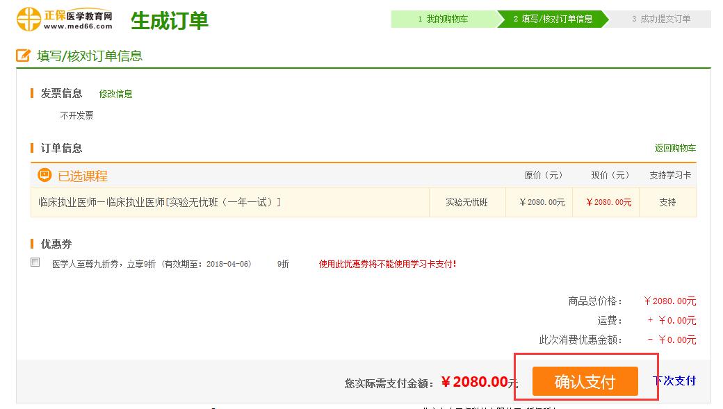 5、提交订单后会显示生成订单页面,确认已选课程及支付金额,点击“确认支付”即可。