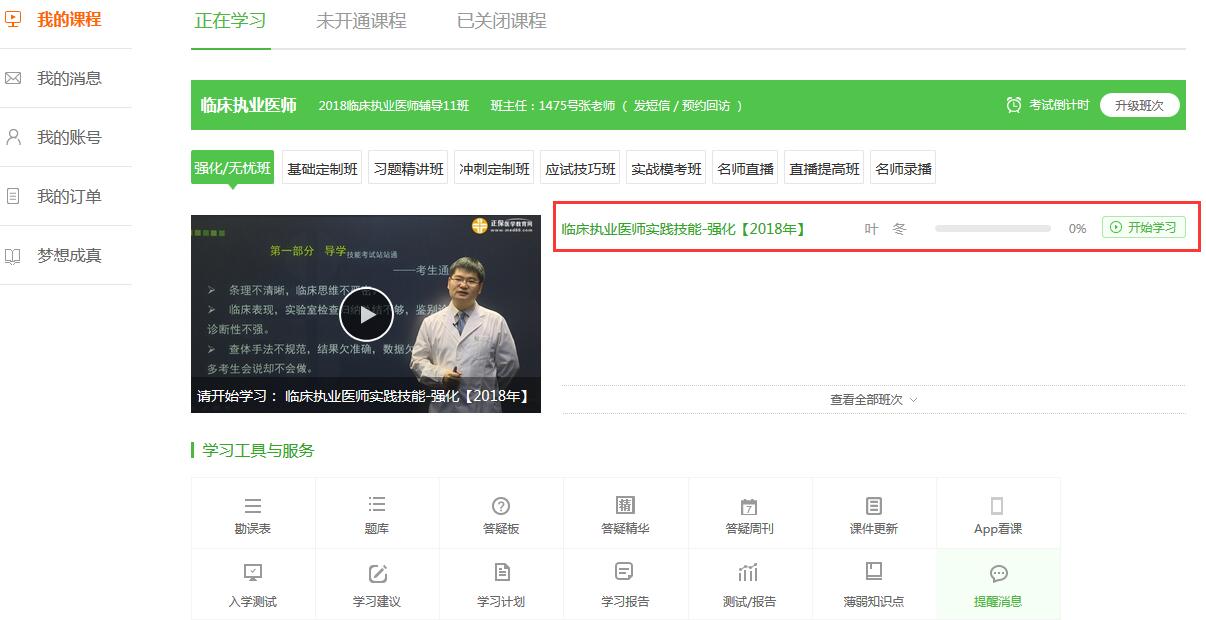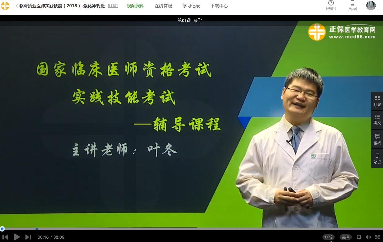 3、选择课程“临床执业医师实践技能-强化”下某一章节,点击“听课”,即可进入课程。