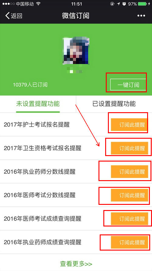 第六步:点击:第五步图片里的“阅读全文”,进入微信订阅页面(如下图所示),点击您想订阅的内容,选择订阅后,一旦有该考试的相关信息,您的微信都将以最快得速度收到医学教育网给您发的考试动态信息(当然您手机的是连接网络状态哟)