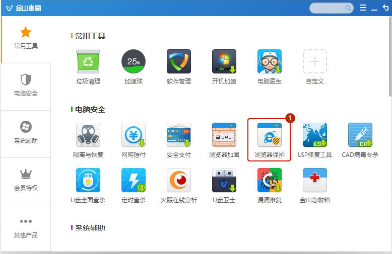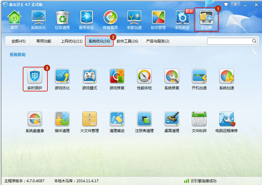 第一步:打开金山卫士主界面,点击“百宝箱”选项卡,选择“系统优化”,点击“实时保护”。