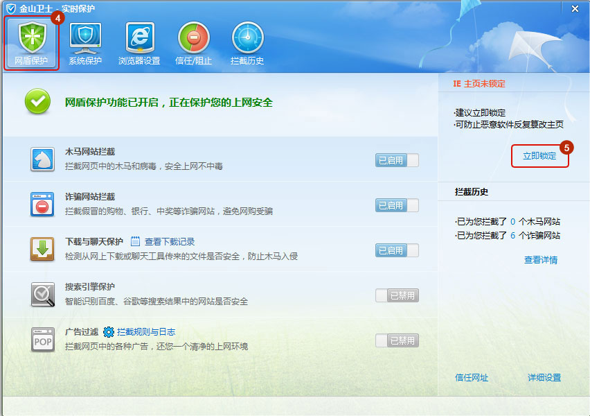 第二步:打开“网盾保护”选项卡,点击右方“立即锁定”。
