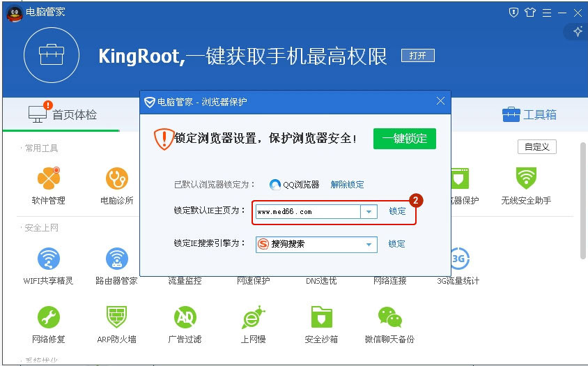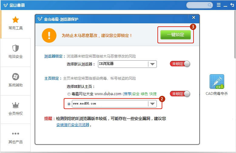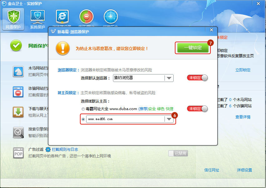 第二步:在主页锁定为里面输入:www.med66.com, 点击“安全锁定”即可。
