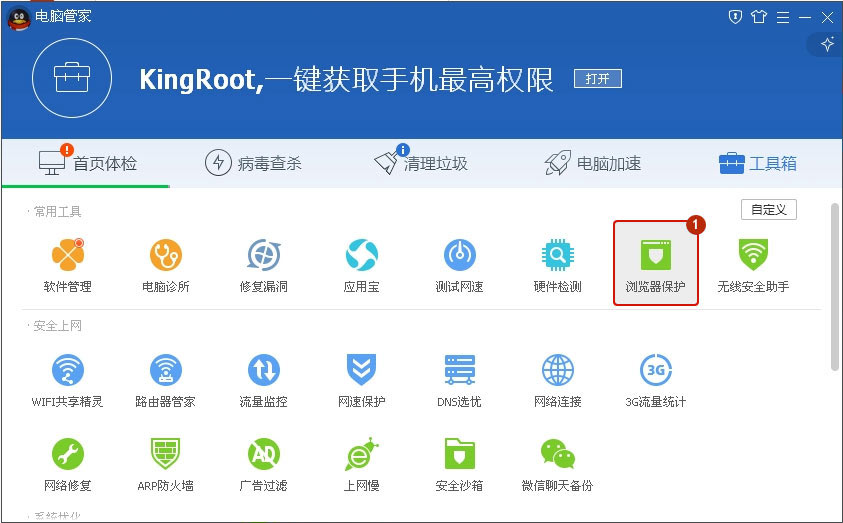 第一步:打开QQ电脑管家首页,点击“工具箱”中的“浏览器保护”。