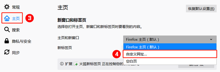 第二步:进入"主页"选项,点击“Firefox主页(默认)”后,选择“自定义网址”。