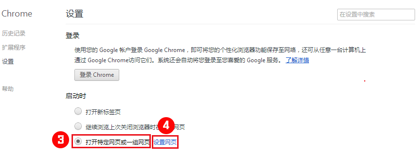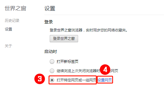 第二步:在启动时,点击“打开特定网页或一组网页”后,点击“设置网页”。