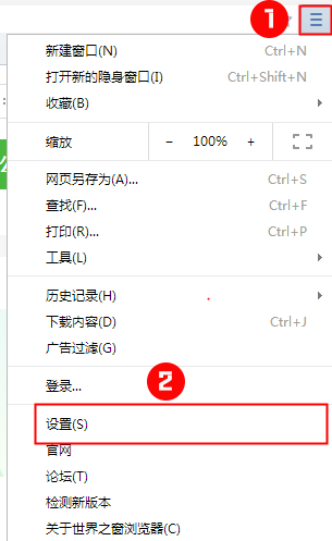 第一步:打开世界之窗浏览器,然后点击右上角列表按钮-设置,如图所示: