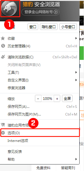第一步:打开猎豹浏览器输入并访问 www.med66.com后,点击左上角豹头>>选项。