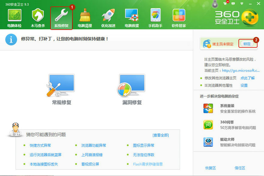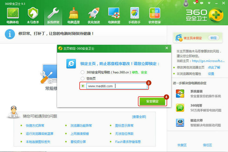 第一步:打开360安全卫士-系统修复-IE常规的“锁定”。