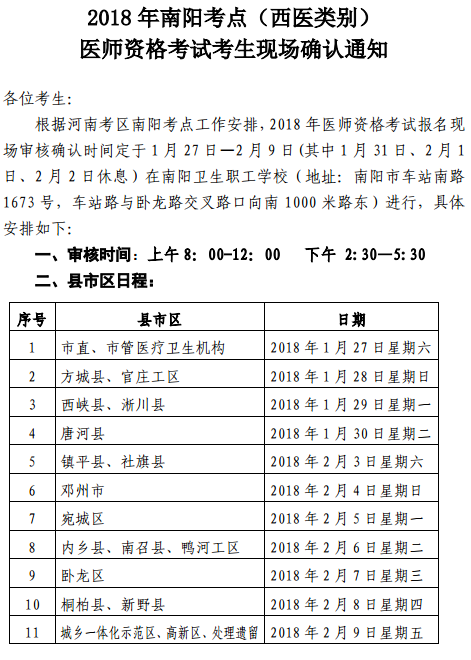 2018年河南南阳市医师资格考试西医类现场确认时间安排已经公布,相信这是很多南阳市考生都非常关注的,下面医学教育网小编特将2018年河南南阳市医师资格考试西医类现场确认时间安排整理如下: