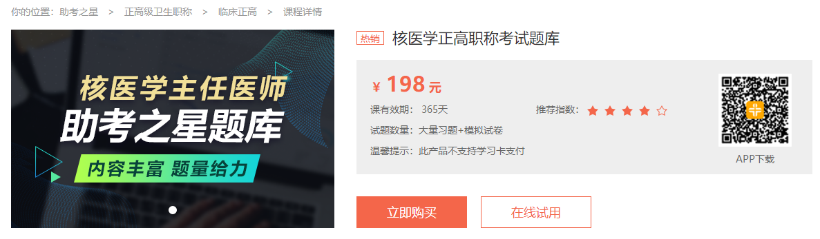 《核医学高级职称助考之星题库》系卫生系列高级职称考试题辅导软件,适用于核医学正、副高级卫生专业技术资格考试。题库设计紧扣考试大纲、考试教材、考试科目、国家卫计委颁布的人机对话标准版。符合医学高级职称核医学考试题型与考试科目,考试资料丰富,免费试用、试题库大,软件收录专业题库高级试题,囊括了目前所有的考试题型仿真试题,并对部分难度较大试题提供专业级的解题思路、答题技巧、考试要点精解。通过人机对话的互动模式即可全面复习、又能有针对性的强化训练,提高应试能力,助您考试成功!