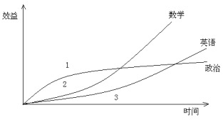 数学、英语、政治三门课的复习有对应的三条时间-效益曲线,分别表示了随着花在各门课上的复习时间增长而发生的水平增长情况。