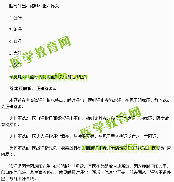 医学教育网——中医执业助理医师考试辅导系列谈之《中医诊断学》辅导:盗汗