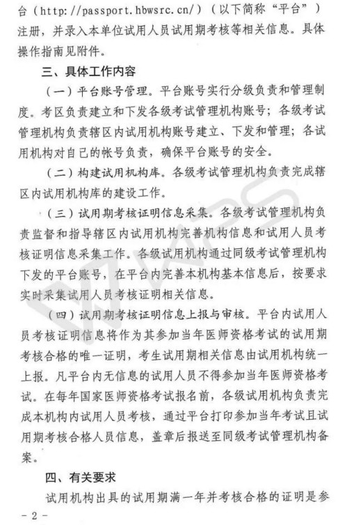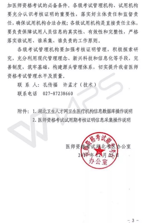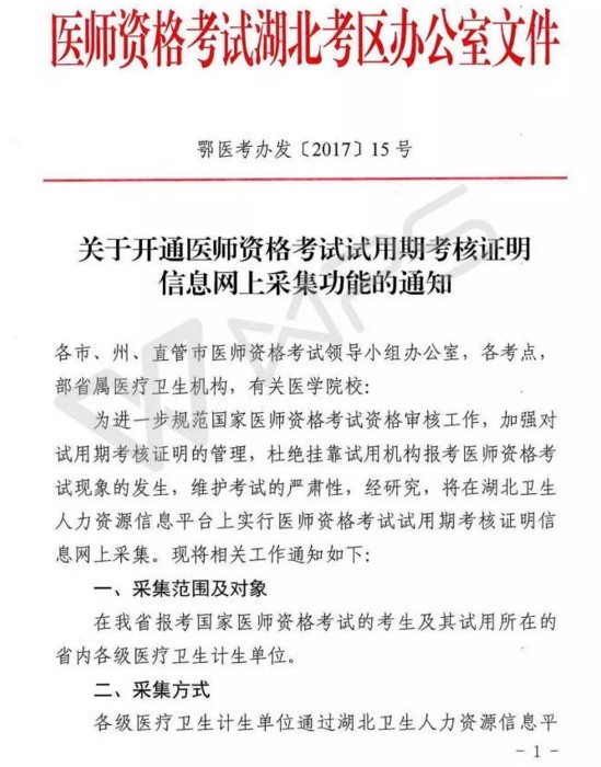 2018年湖北省开通医师资格考试试用期考核证明信息网上采集功能,也就是说2018年期凡是参加医师资格考试的湖北省考生必须由单位给您录入省试用考核系统,只有录入信息的人员才有资格参加医师考试,从而杜绝考试现象。