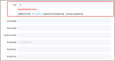 如引用的学历信息有误,请按照页面提示(如下图所示),在“学历学位信息维护”页面添加正确的学历信息后,再重新引用。