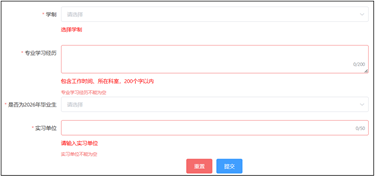 依次填写“学制”“专业学习经历”“是否为2026年毕业生”、“实习单位”。