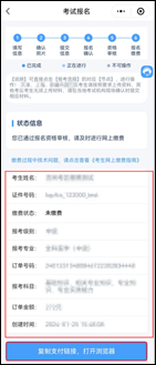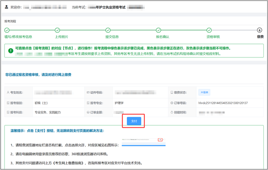 点击报考流程中的【报名缴费】节点,核对报考专业科目和金额,确认无误后按系统提示进行缴。