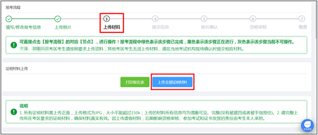 填写信息完成后,系统将跳转至【上传材料】节点,进入上传材料页面。考生可先点击“查看报名表”,下载并打印报名申请表,然后按照考区的要求上传相关证明材料。