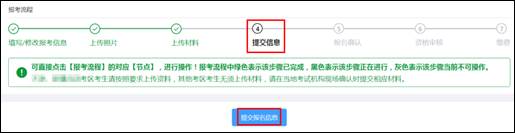 材料上传完成后系统将跳转至【提交信息】页,考生也可点击报考流程中的【提交信息】节点,确认无误后点击“提交报名信息”。