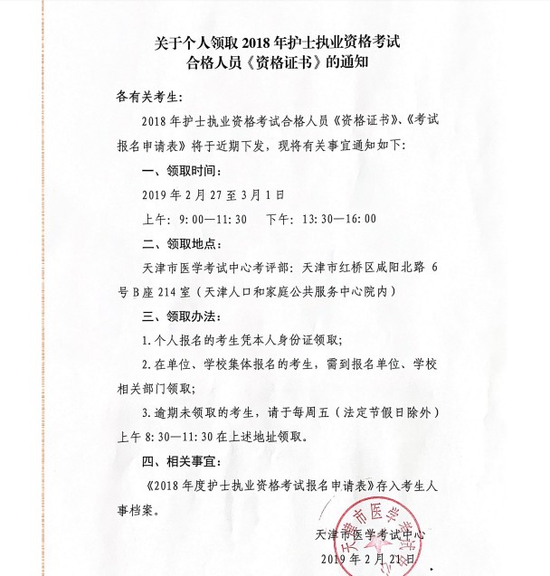 天津2018年护士资格考试证书领取时间已经公布,为了帮助大家了解,医学教育网为大家搜集整理如下: