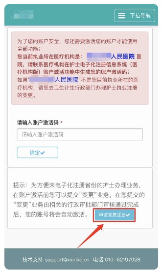 如属于以上两种情况之一,可在护士电子化个人端激活界面下方【申请变更注册】功能办理“变更”业务,提交的“变更”业务由卫健委审批通过后,护士账号将会自动激活。