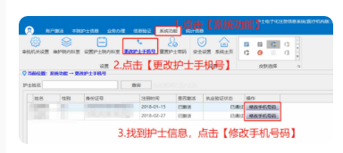 联系当前注册医疗机构,登录《护士电子化注册信息系统(机构版)》,在“系统功能”-“更改护士手机号”中给护士个人“更换护士手机号”(注意:护士电子化账户激活并且手机号已验证机构端才能“更换护士手机号”)。