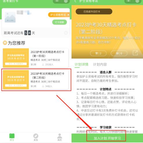 第三步:请选择“您的备考计划”,如“2023护考30天精选考点打卡(第三阶段)”,点击下方“加入计划开始学习”