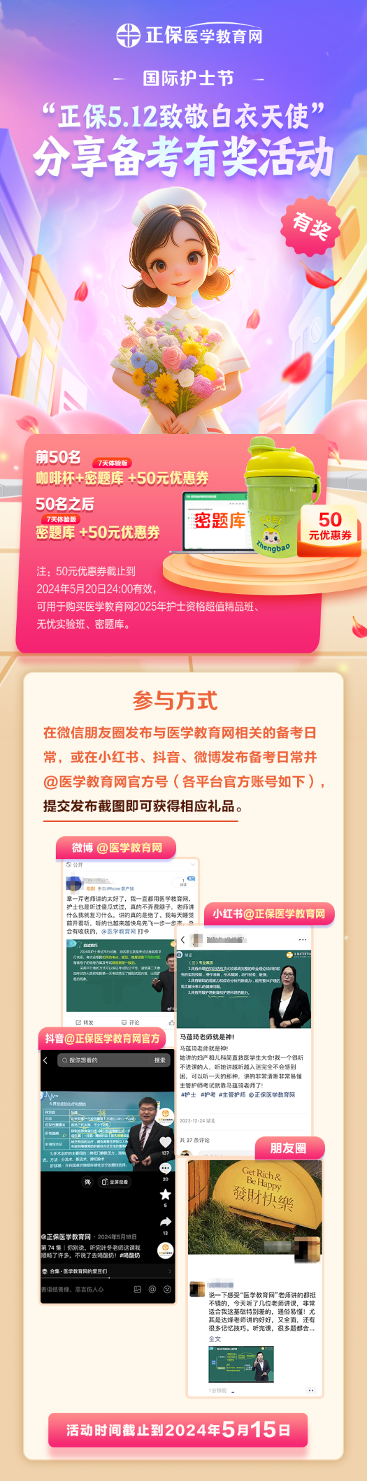 注:50元优惠券截止到2024年5月20日24:00有效,可用于购买医学教育网2025年护士/初级护师/主管护师超值精品班、无忧实验班、密题库。