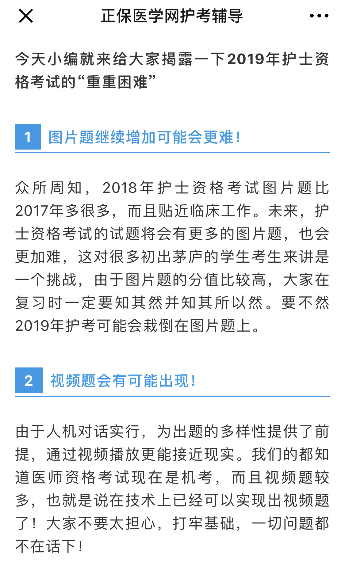面对护士试题变化,不知道如何复习?不知道实际考试如何操作?别慌!快来医学教育网!网校会在考前密训班中针对视频选择题提供应试指导、专项练习,请各位考生安心复习,预祝各位考生都能顺利通过2019护士资格考试!