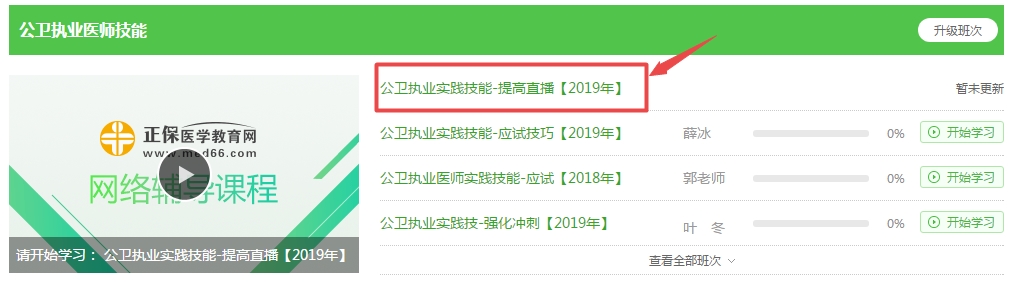 电脑端看课:从医学教育网首页进入“我的网校我的家”-“我的课程”-“公卫执业医师实践技能”-“提高直播【2019年】”(以公卫执业医师为例,如下)
