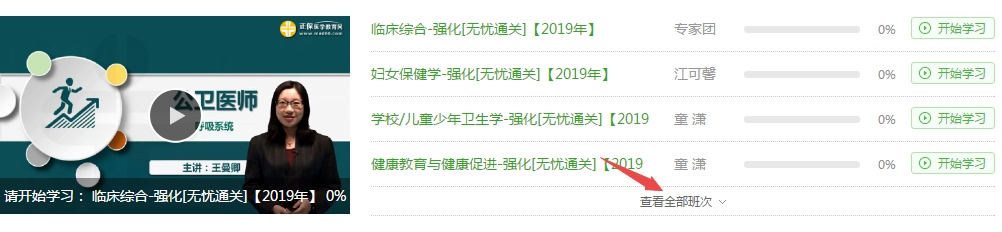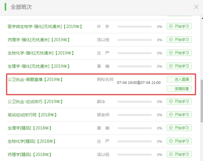 电脑端看课:从医学教育网首页进入“我的网校我的家”-“我的课程”-“查看更多班次”-“刷题直播”(以公卫执业医师为例,如下)