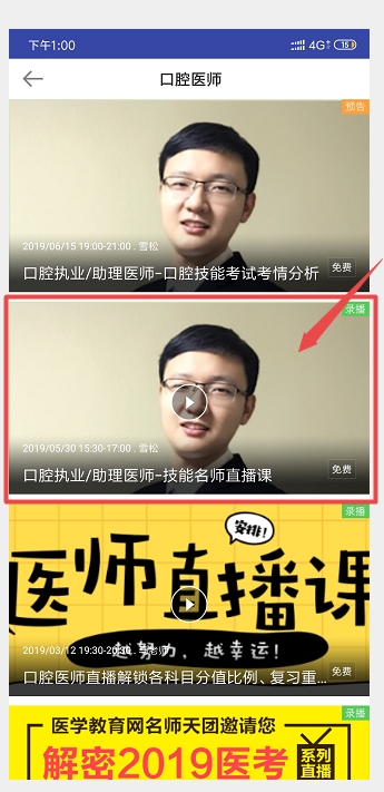 3、点击下方“直播”-->“口腔医师”-->“口腔医师技能老师直播”。