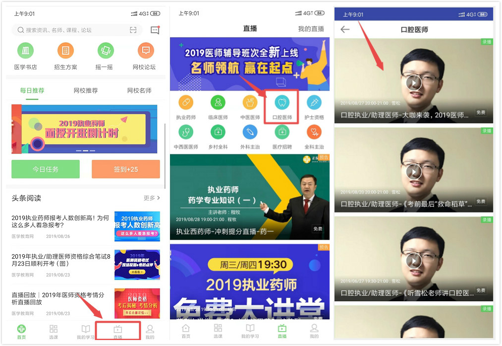 3、点击下方“直播”-->进入列表页,找到口腔执业/助理医师老师直播课,点击进入后就可观看课程。