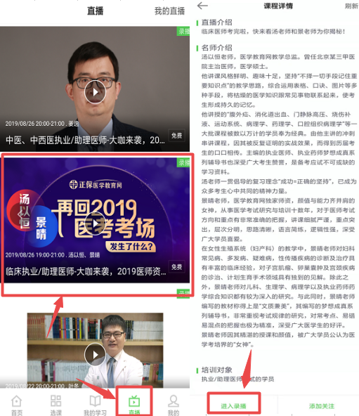 3、点击下方“直播”-->进入列表页,找到临床执业/助理医师老师直播课,点击进入后就可观看课程。