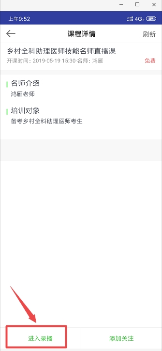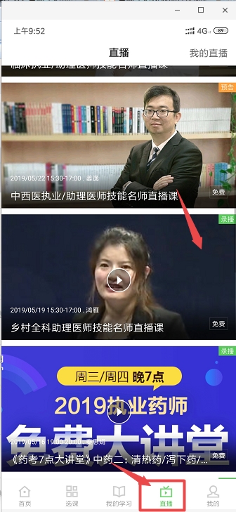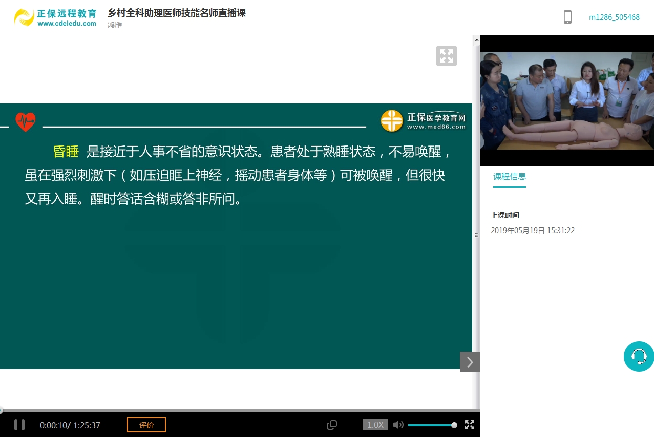 视频默认是讲义界面,您可以按照如下图, 点击切换按钮,即可切换成视频大屏模式↓↓↓ (2)手机端直播回放: 1、下载安装医学教育网App(//www.med66.com/zhuanti/2017newApp/index.shtml); 2、使用学员账号和密码登录; 3、点击下方“直播”-->“我的直播”-->“乡村全科助理医师技能老师直播”。 进入录播 图标切换说明 切换之后 老师介绍: 老师,医学博士,副教授,工作于三甲医院,医学教育内科学辅导书主编人。从事医学培训近十年。 老师自信大方,授课主次分明。喜欢采用“考点分割与学科相关知识大串联”的讲课方法,善于运用原创知识点速记方法和技巧,对重难点把握精准。风格生动活泼,深受广大考生喜爱。